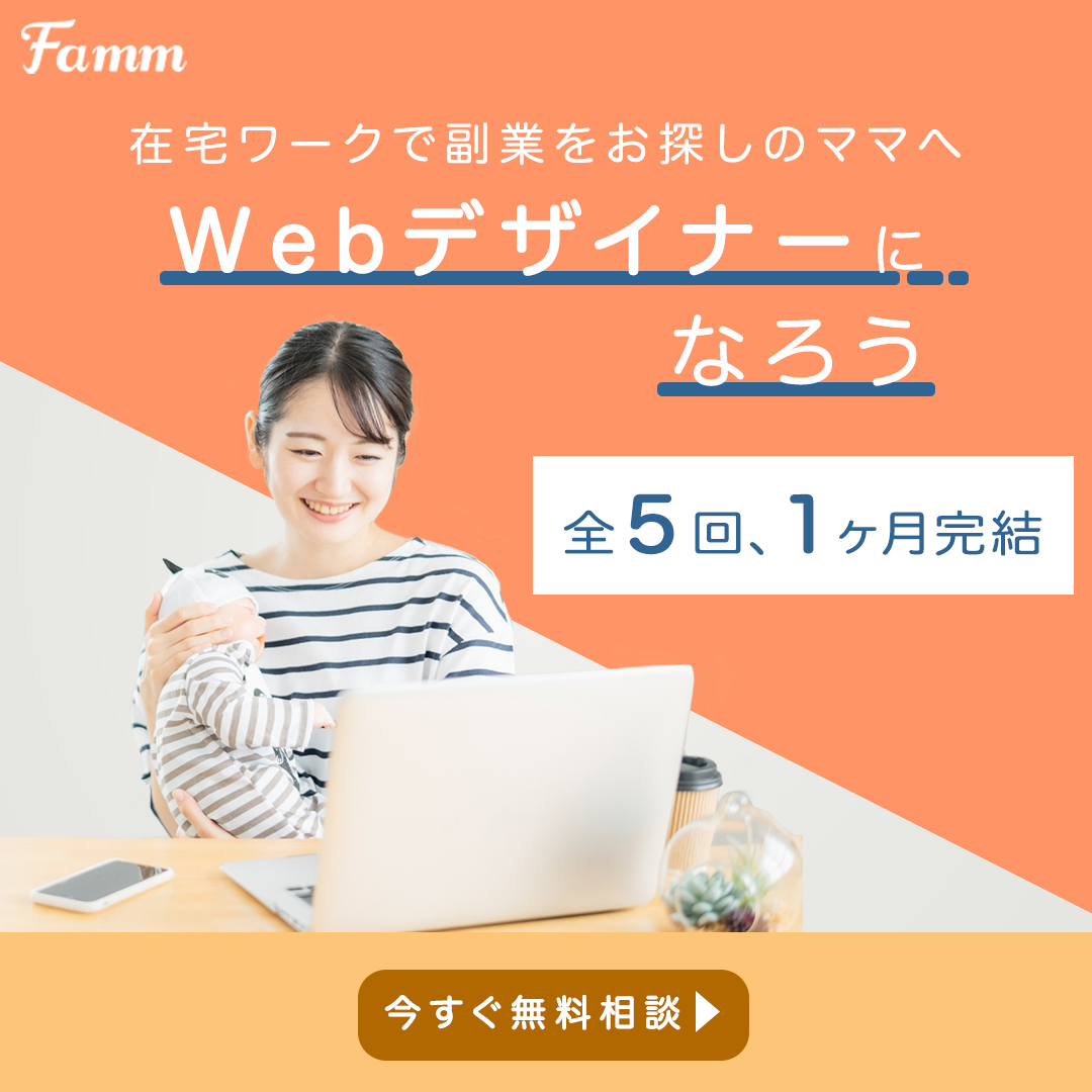 FammママWebデザイン講座へ興味を持ってもらえるよう、親しみやすさや講座受講へ明るいイメージが湧くようデザインしました